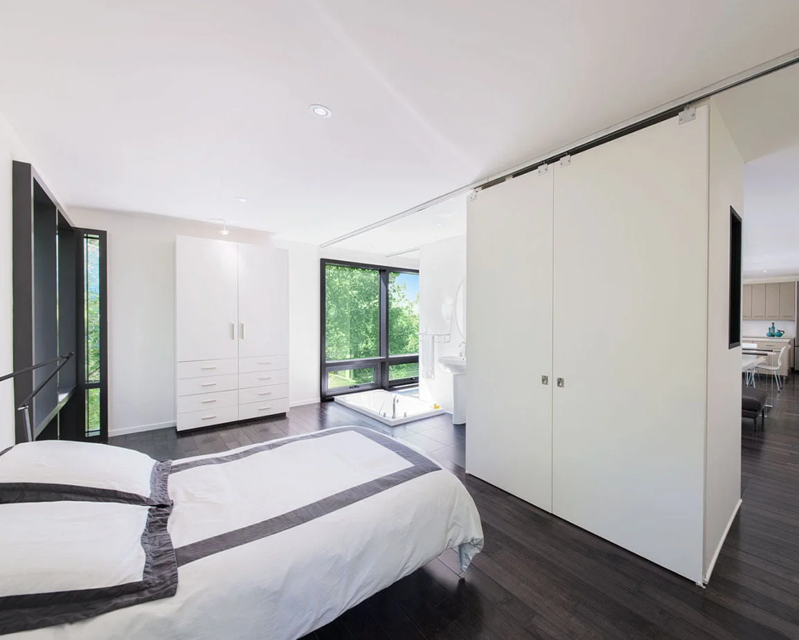 Left: In our Chelsea Hill house, a large soaking tub in the second floor master bedroom is suspended both above the lower level and in the forest’s treetops.
