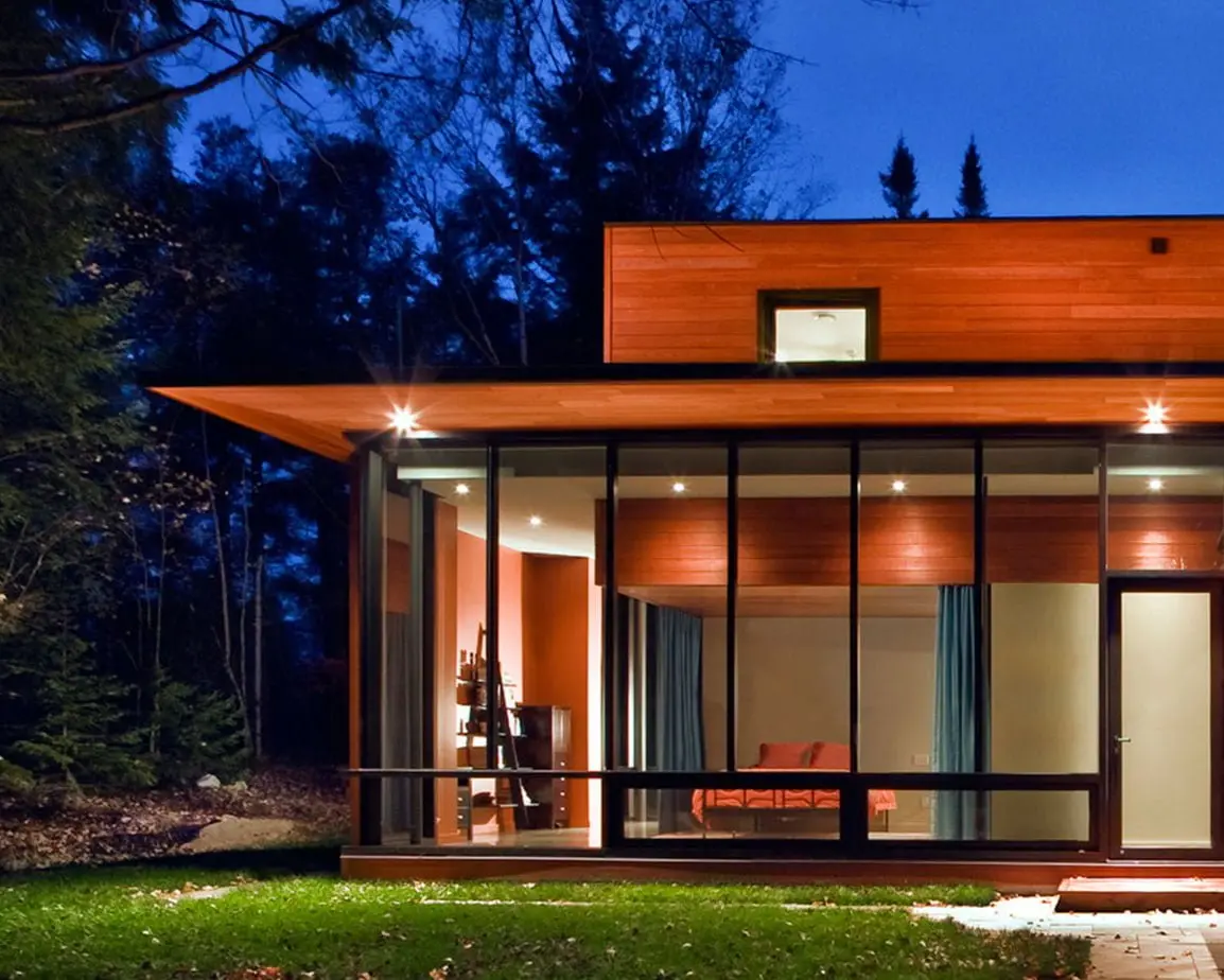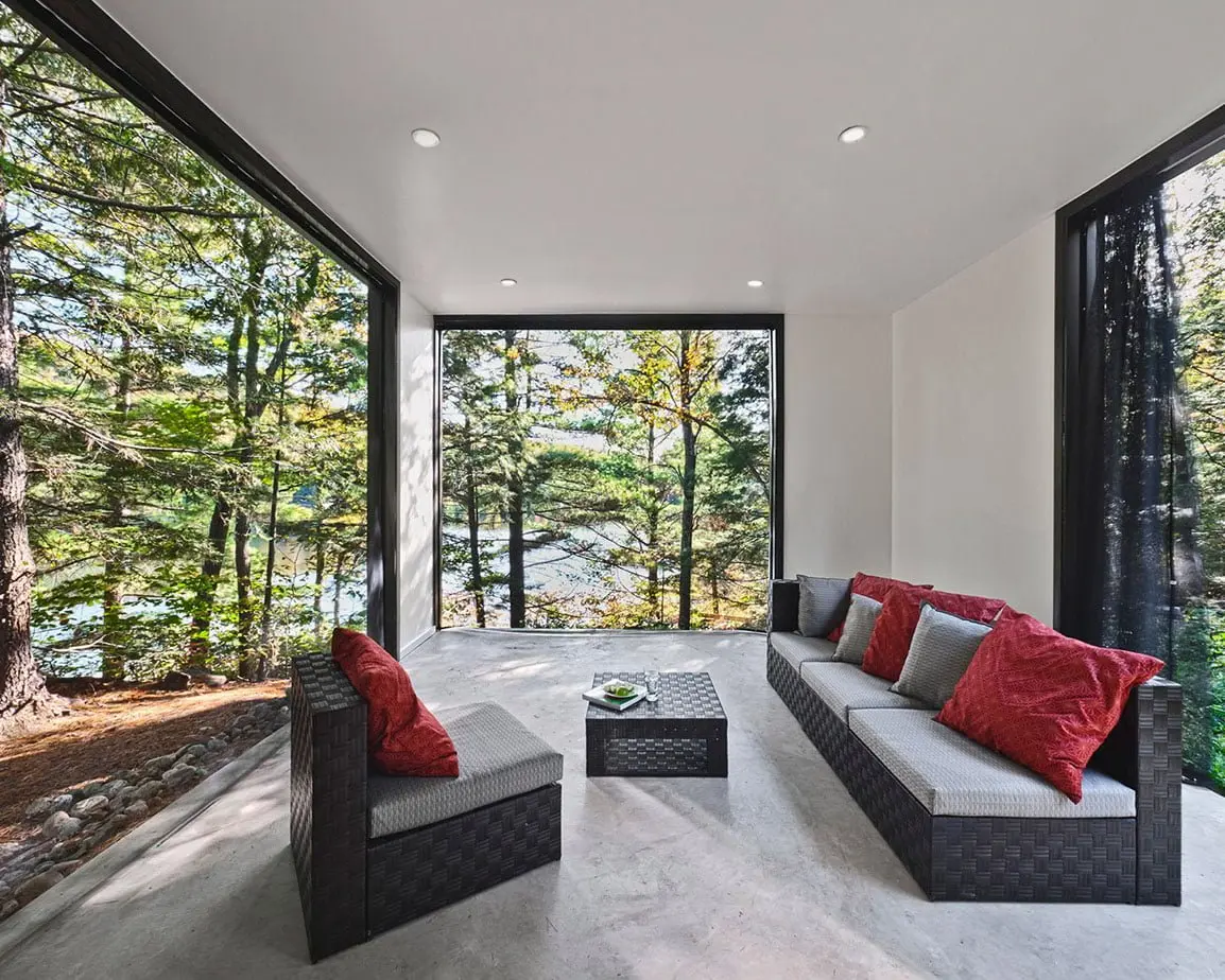 Right: The living room at the Hill-Maheux cottage has an equal part of its volume on the inside and outside. Shown here is the exterior, but it is a covered space that is fitted with a retractable insect curtain.
